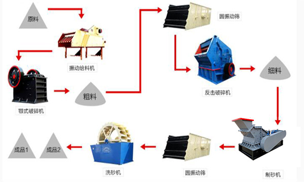 一步河卵石原材料進入振動給料機,通過提升機將河卵石物料輸送到顎式破碎機進行破碎;二步,產成的粗料由膠帶輸送機輸送至細碎機進行進一步破碎;三步,細碎后的河卵石進振動篩篩分出兩種不同粒度的石子,滿足制砂機進料粒度的石子進制砂機制砂,另一部分料返回再進細破;通過制砂機將其制成砂,經洗砂機清洗后制成成品砂,終產出符合要求的產品粒型。